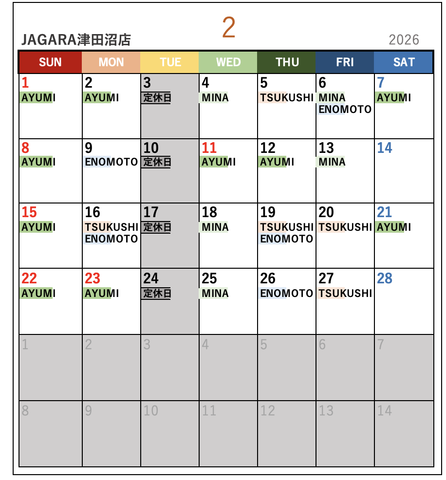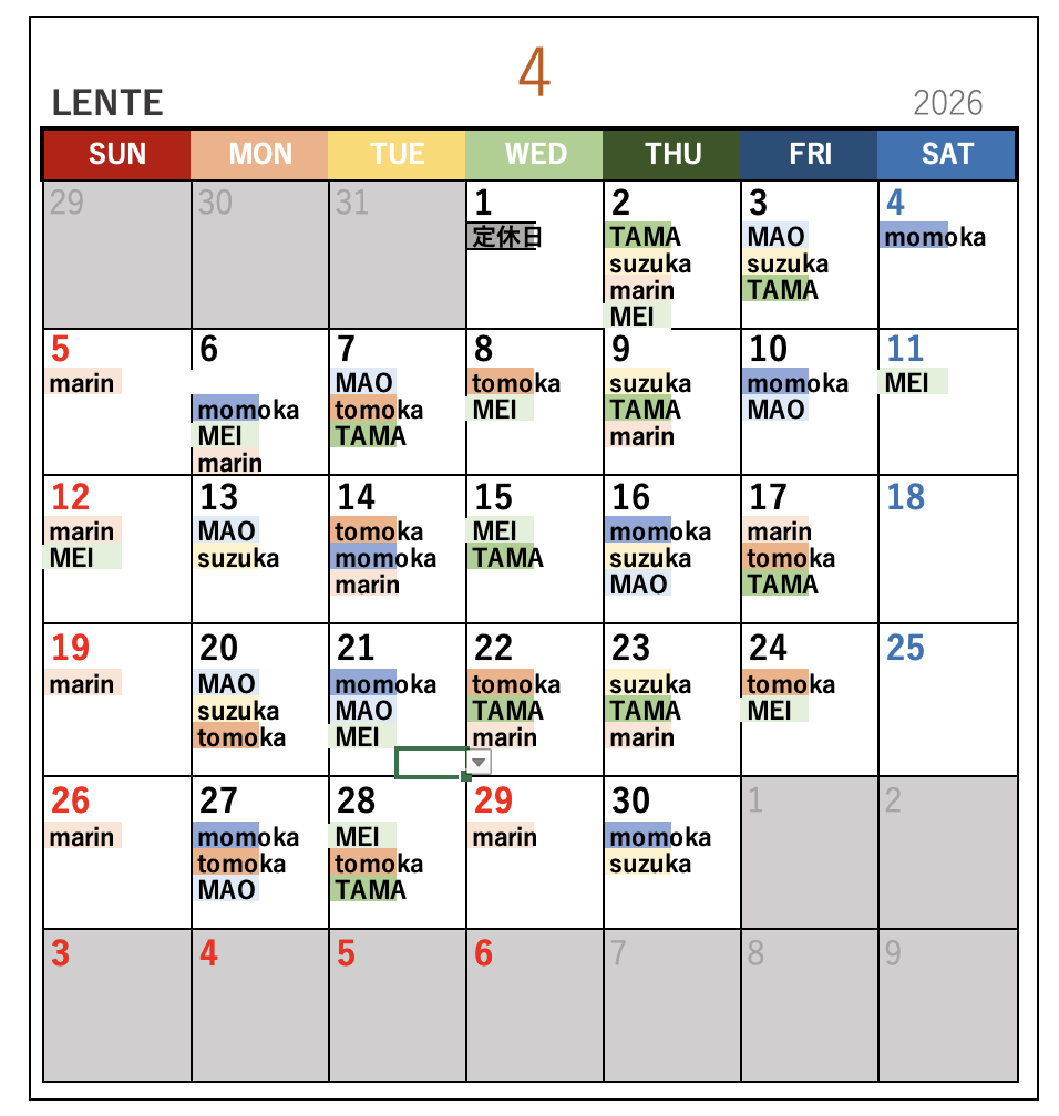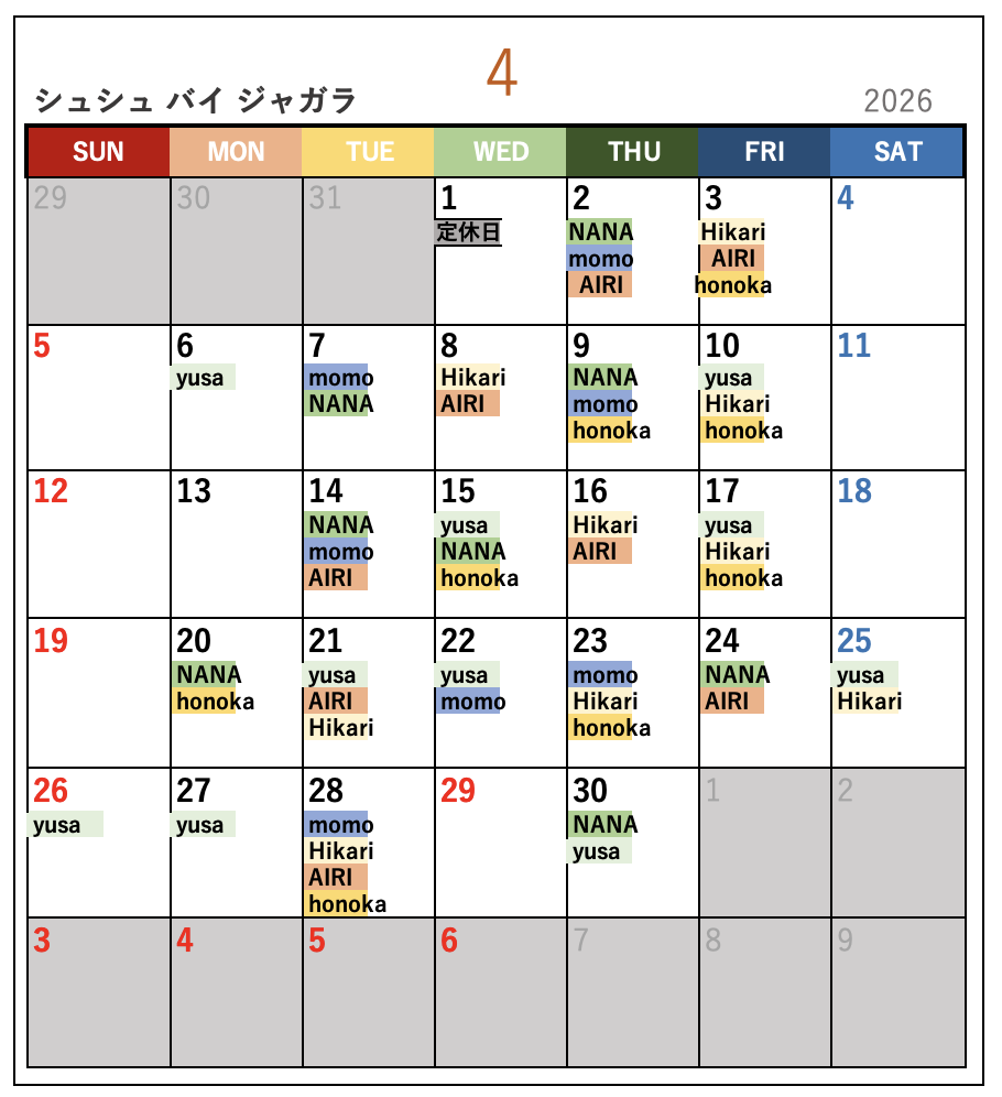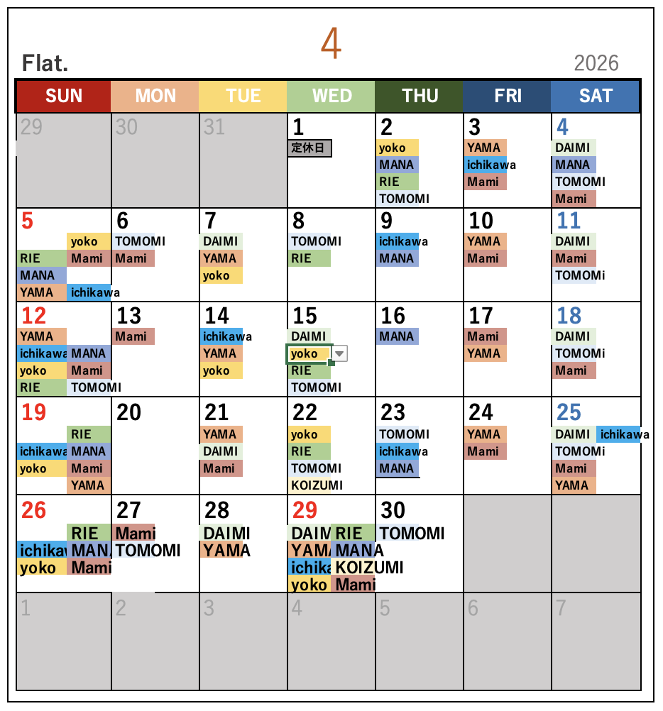 名前が書いてある日がお休みになります。
