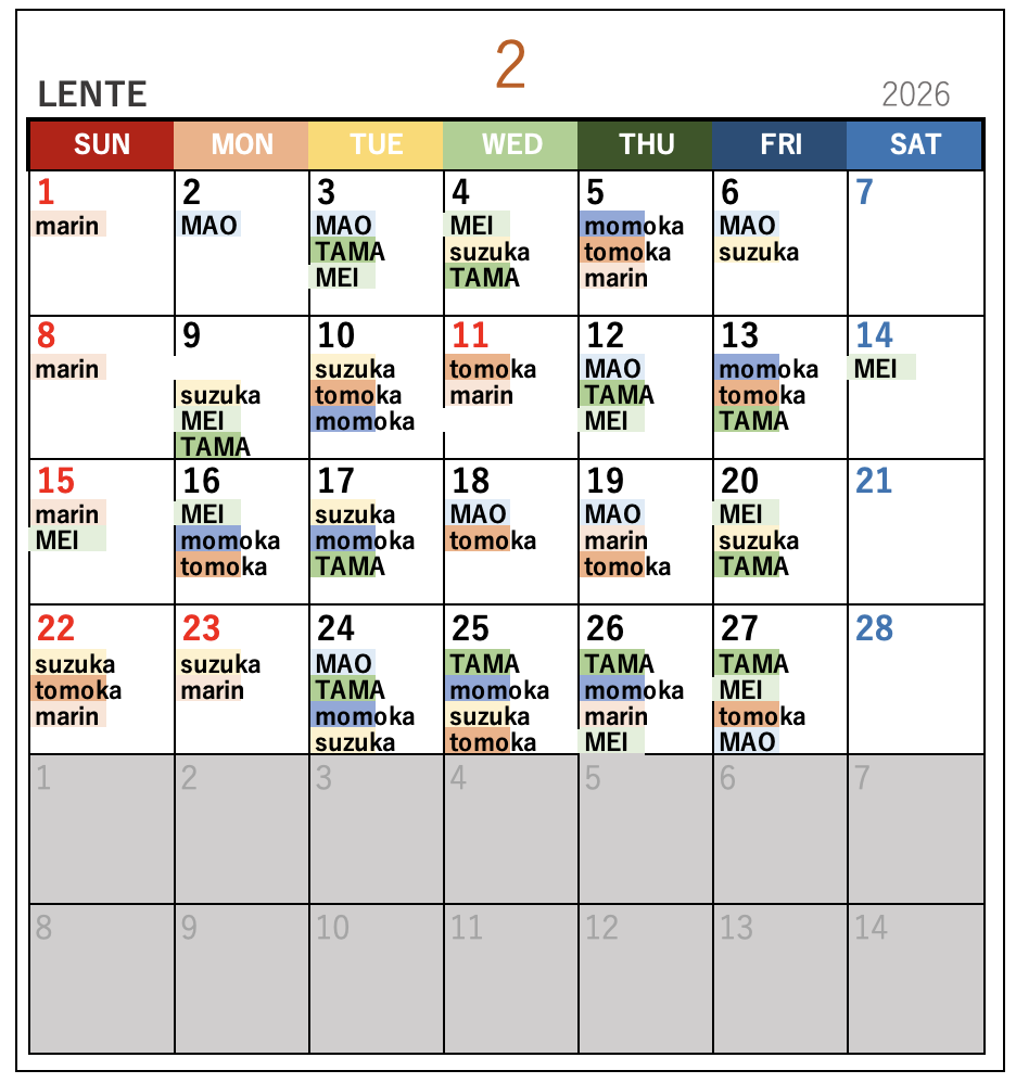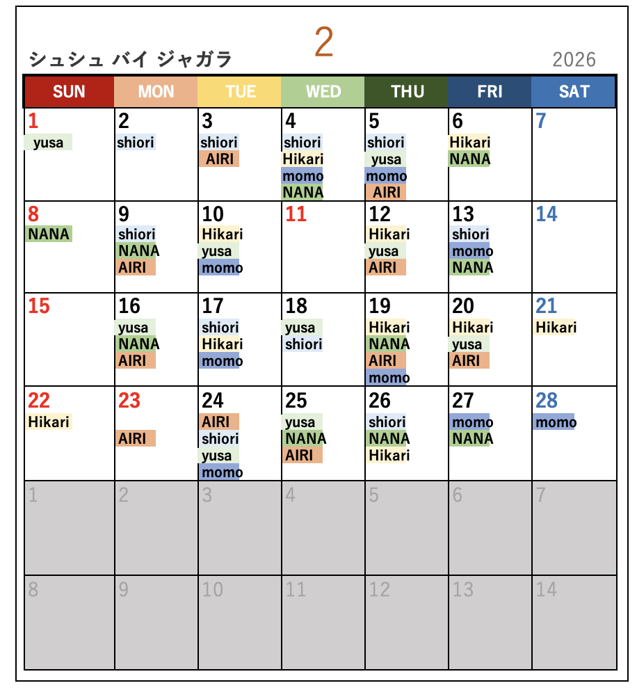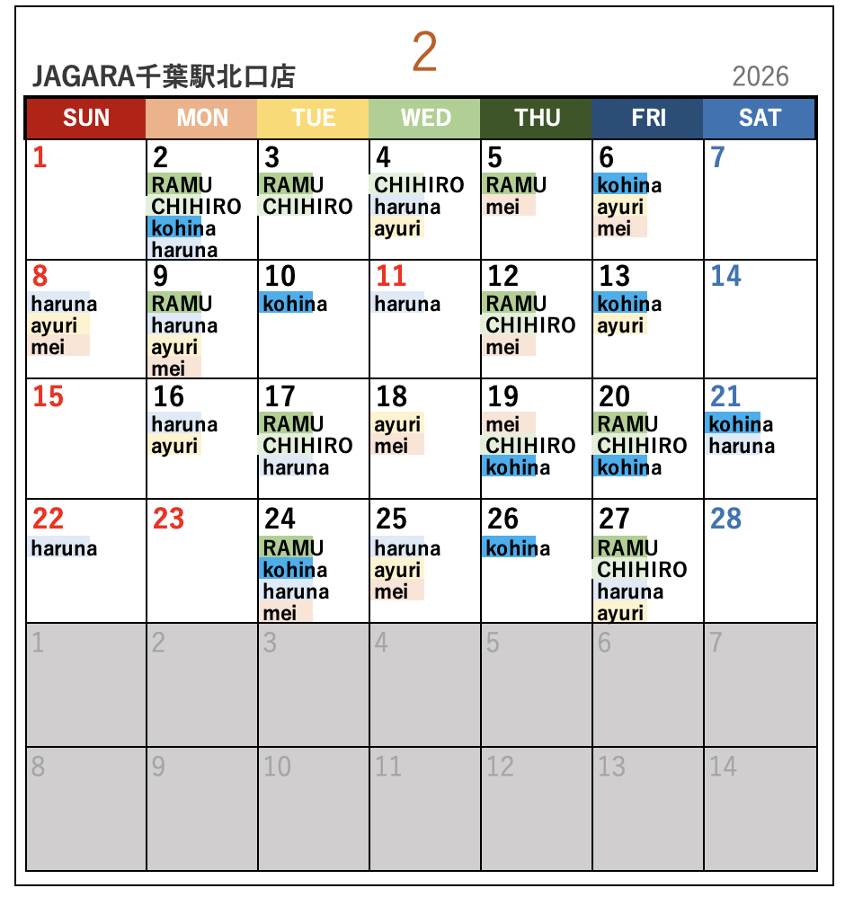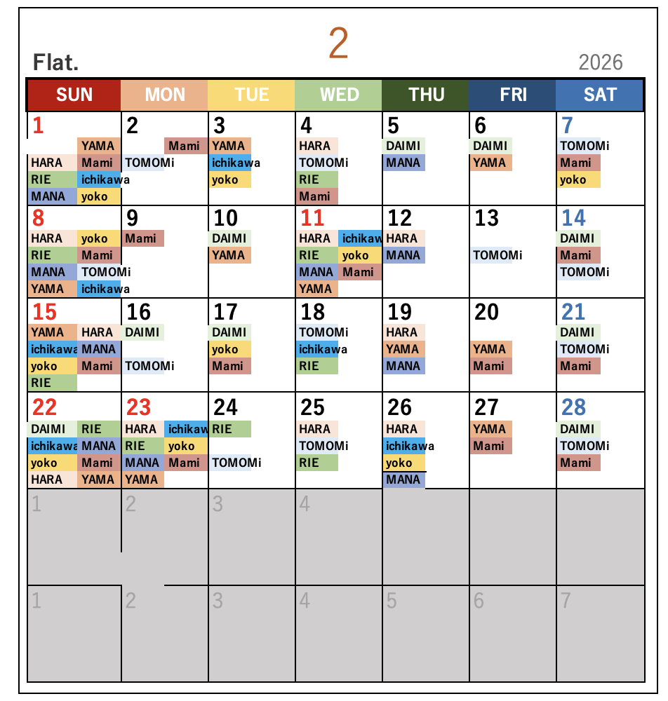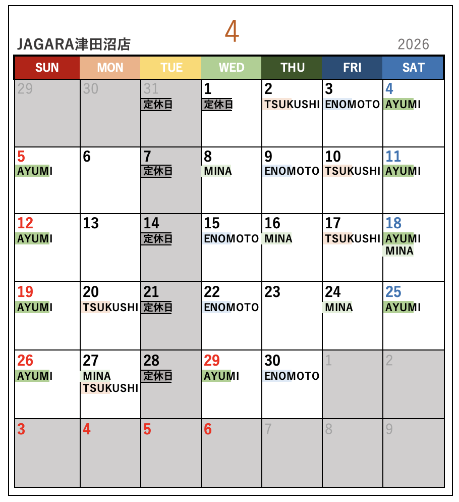 名前が書いてある日がお休みになります。